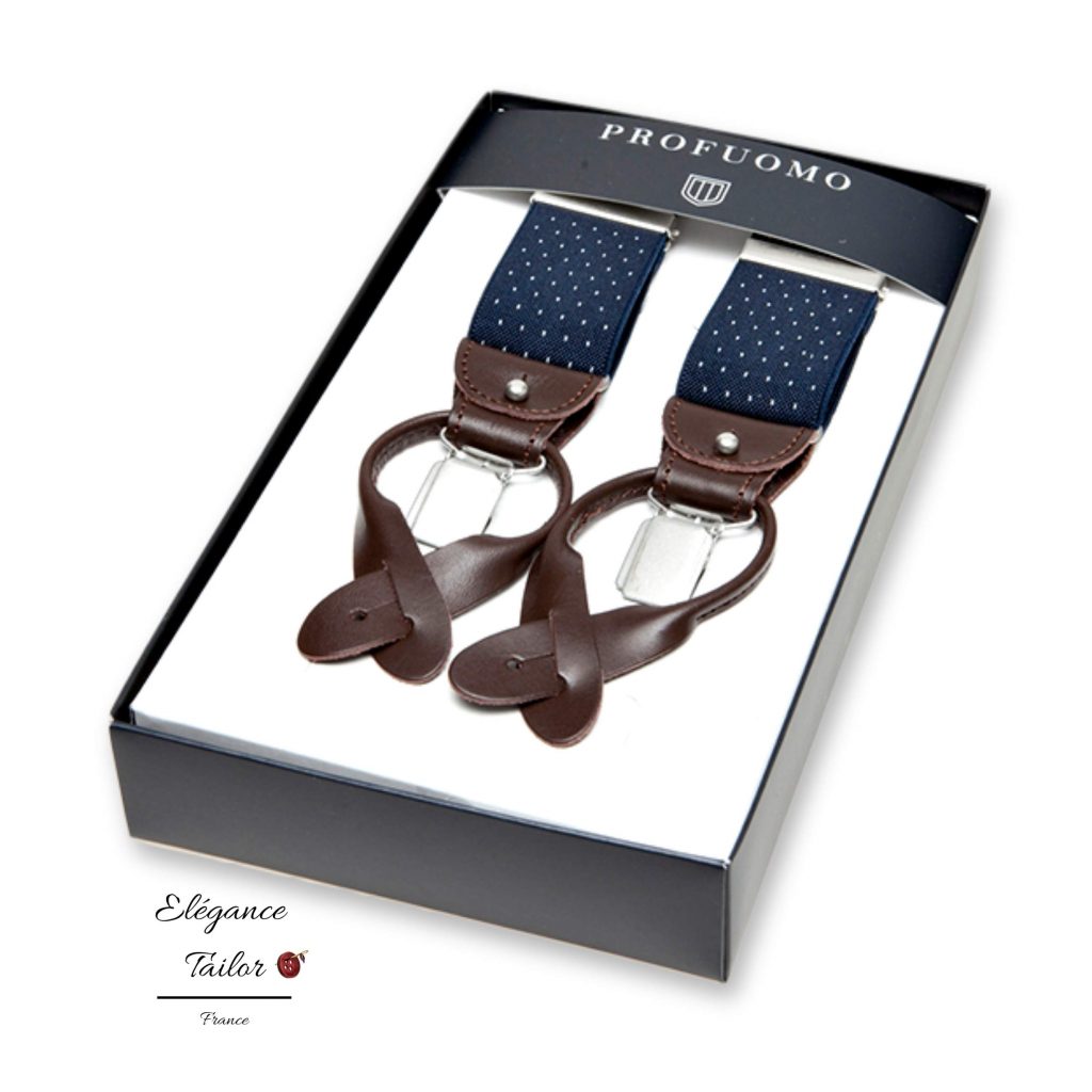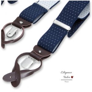 Pour montrer les bretelles dans la vie quotidienne, nous pouvons utiliser un Jean, un simple t-shirt blanc; les experts de chez Elégance Tailor Toulon conseillent de combiner avec des bretelles pour la couleur des chaussettes, par exemple, rouge ou bleu. La recommandation principale est de ne pas utiliser plus de 4 nuances différentes dans une tenue. La couleur des bretelles peut correspondre à la couleur de la cravate, par exemple, ces bretelles à pois se marieront bien avec une cravate en soie bleue de chez Elégance Tailor Toulon.