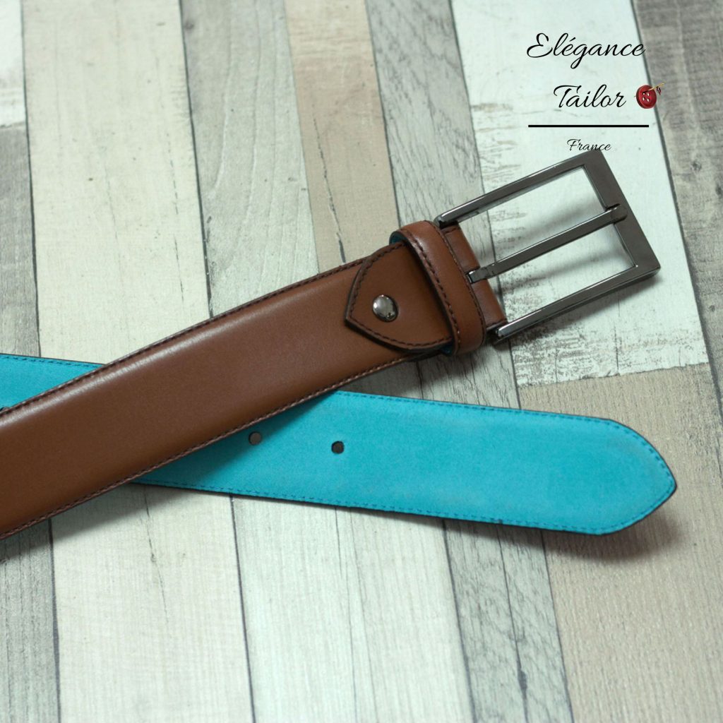 Un charme spécial de ce modèle ajoute la couleur turquoise profonde sur la doublure. Cela deviendra un détail attrayant mais caché de votre tenue. Cette ceinture est parfaite pour un costume strictement de mariage et le rendra un peu plus original et pertinent.